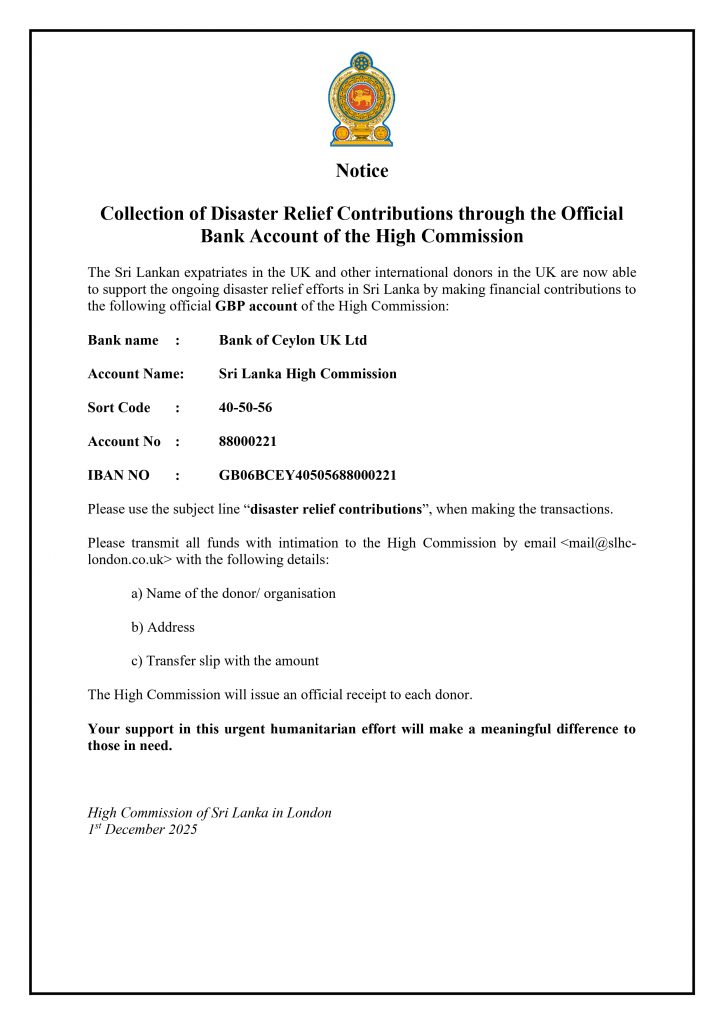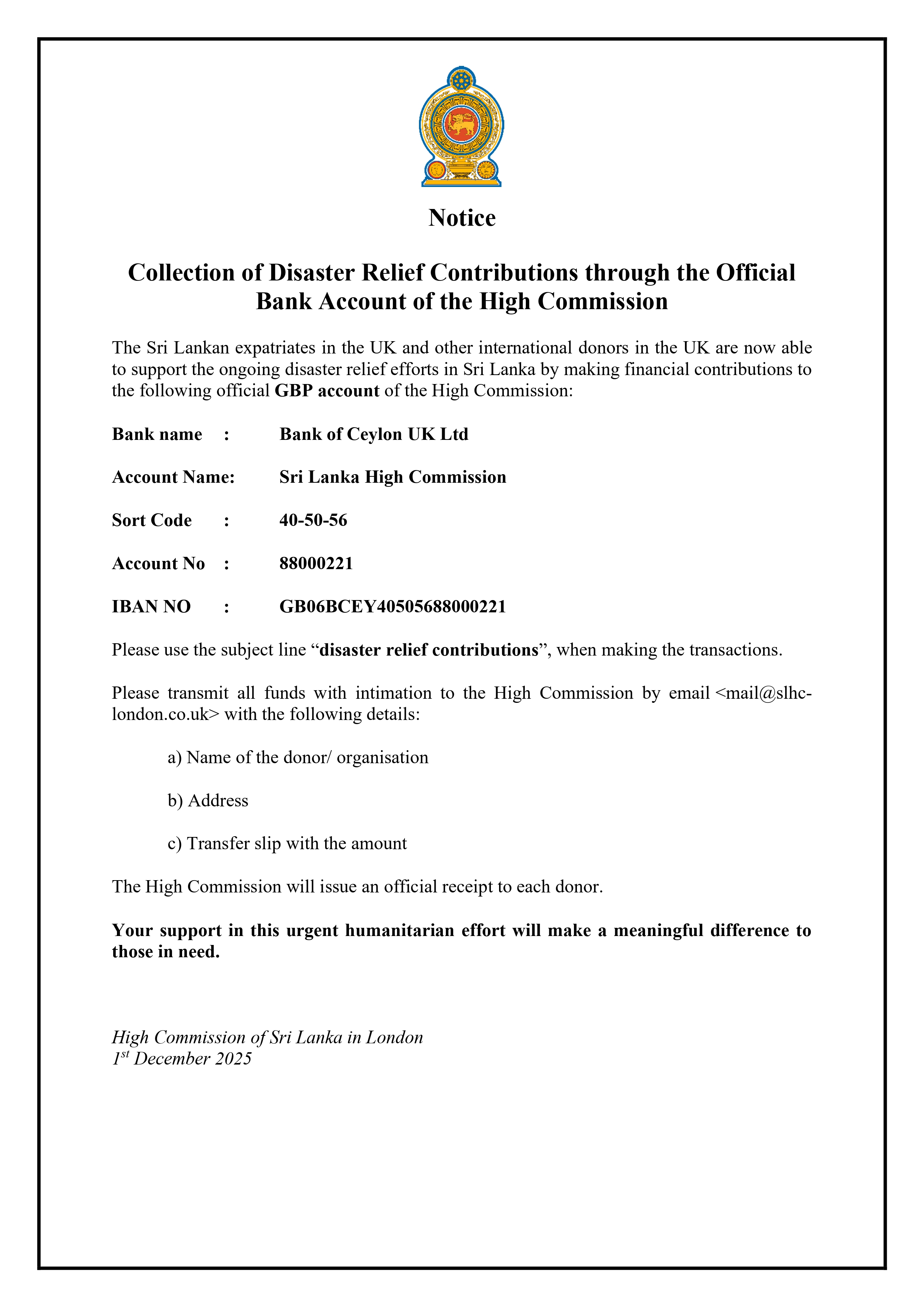 Collection of Disaster Relief Contributions through the Official Bank Account of the High Commission December 1, 2025 General, News