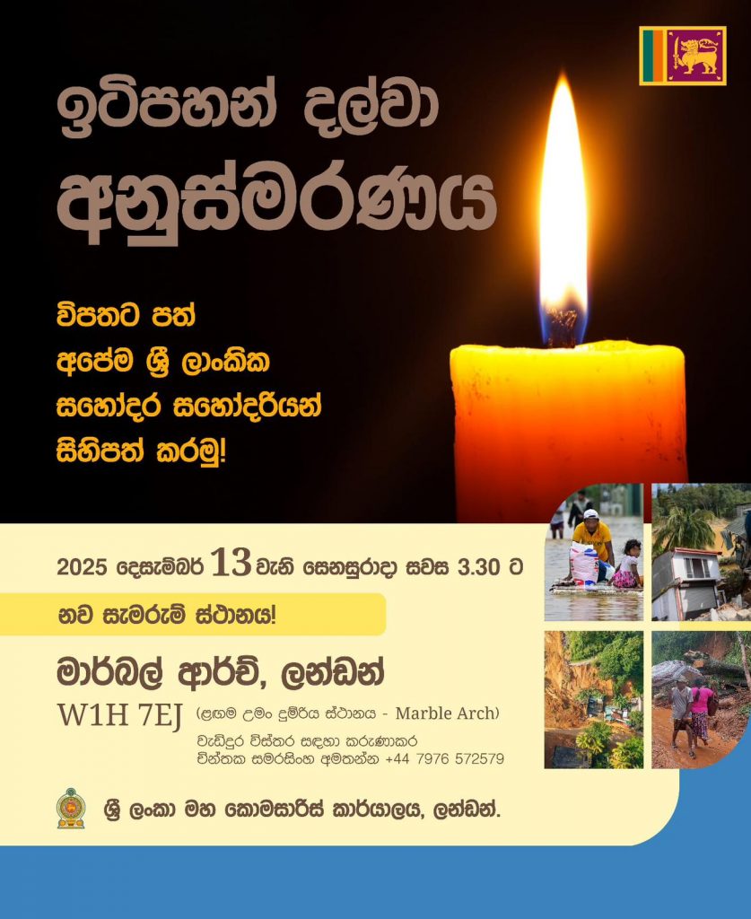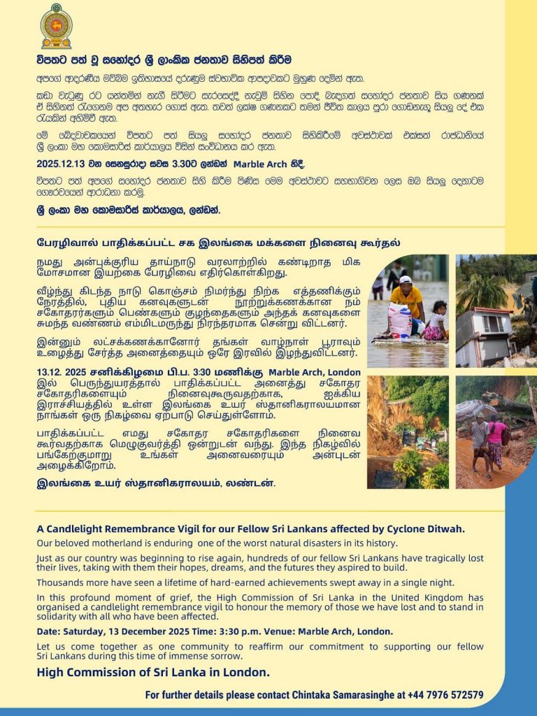 The High Commission of Sri Lanka in the United Kingdom invited Sri Lankan religious institutions across the UK to hold observances on 6 December 2026 in memory of the victims of Cyclone Ditwah and to offer prayers for healing and the recovery of affected communities. Observances were held at Buddhist temples such as London Buddhist Vihara, Kingsbury Buddhist Vihara (organised by the Ranwala Foundation), Athula Dassana International Buddhist Temple, Thames Buddhist Vihara, Birmingham Buddhist Maha Vihara, and Jethavana Buddhist Viharaya, as well as at other religious institutions including Ealing Hindu Temple, Sri Lankan Catholic Chaplaincy and the Sri Lanka Muslim Cultural Centre (SLMCC), Harrow, (in association with the Council of Sri Lankan Muslim Organisations COSMOS UK). High Commission representatives joined some of these events to convey solidarity and support, while numerous other temples, mosques, churches, and religious centres across the UK conducted their own observances during the weekend.